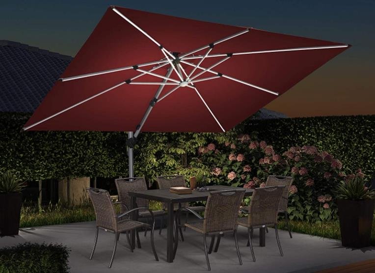 This Square 10 x 10ft Purple Leaf Aluminum patio umbrella with solar-powered LED comes in three versions, i.e., LED bulb, LED tube, and LED +Swivel. The one with a swivel allows you to tilt its canopy sideways at various angles, block the sun from multiple angles during the day.